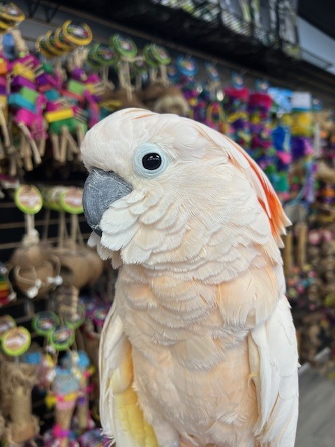 Super sweet and tame Moluccan Cockatoo adult female available. Peaches is a very friendly and tame she loves to talk, dance and wants to cuddle. Call us for more info 773 317 3785.