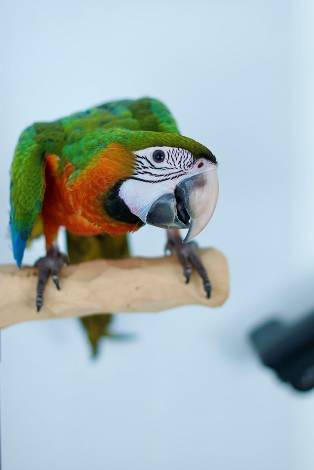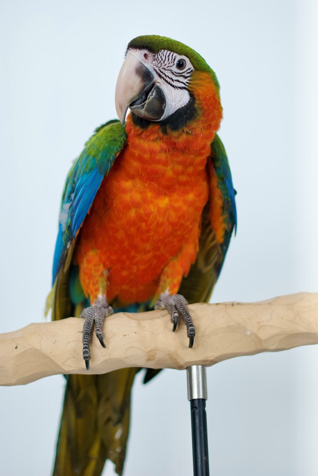 Male Harlequin macaw. Now fully weaned and ready for his new family! He is a hybrid between a Blue and Gold Macaw and a Greenwing Macaw. He is a great eater~ loves his morning chop. He is fully flighted. Already starting to repeat words as well.