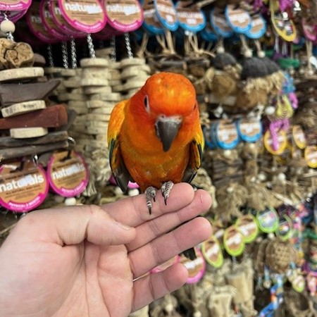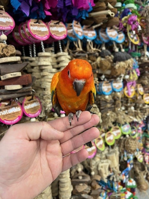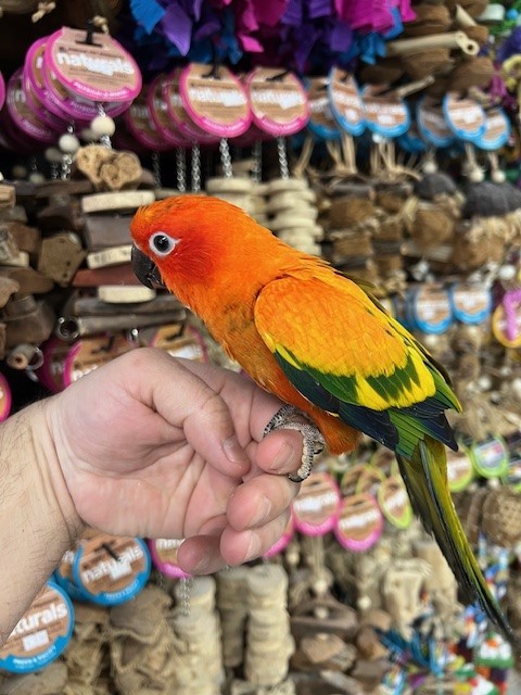 Hand fed baby Red Factor Sun Conure. For more info call 773-317-3785. We are located at 710 Lee St., Des Plaines, IL 60016.