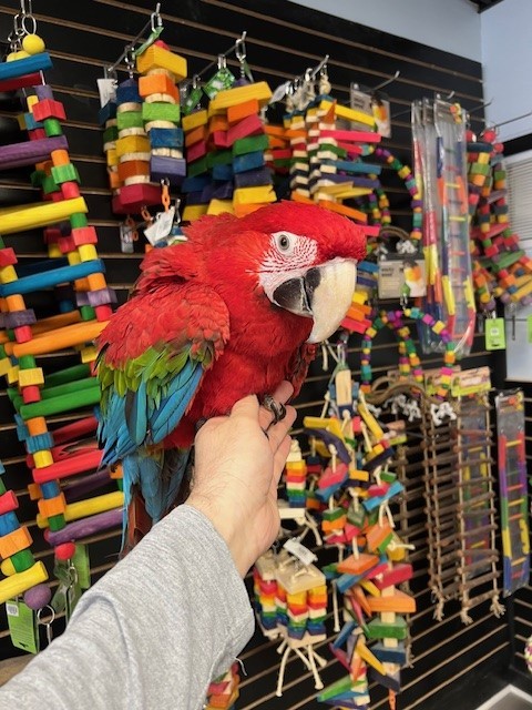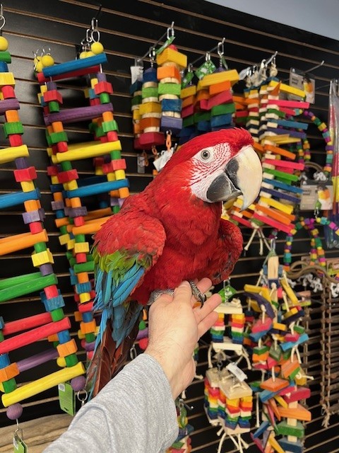 Very sweet and tame dna tested female baby Green Wing Macaw available weaned and ready for its new home. For more info call 773-317-3785. We are located at 710 Lee St., Des Plaines, IL 60016.