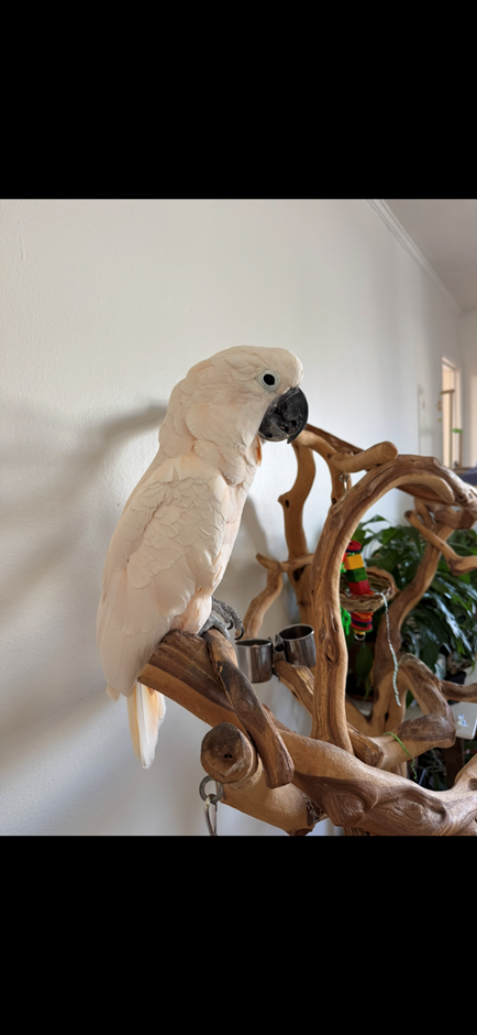 Jojo is a very sweet bird and lovely and enjoys close interaction and bonding. Jojo loves being pet and groomed and has been a spoiled over the years. She has a varied diet and especially enjoys oatmeal with bananas fed to her on a spoon. Jojo has always been a very healthy bird. In recent years, however, she has needed regular beak trims old injury involving a male Moluccan Cockatoo several years ago. Please call or text if you are interested: 4158605624