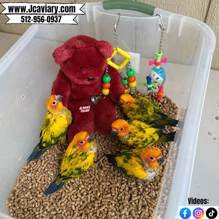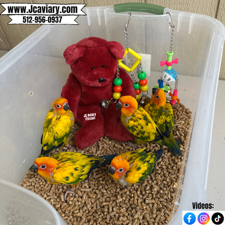 Accepting reservations on these adorable HIGH YELLOW sun conure babies babies. They are STILL being hand-fed but almost weaned. They will be on a healthy diet of organic pellets and vegetables. All our babies are very well socialized, tame and sweet. Please visit our website for full detailed info on these babies -- www.Jcaviary.com-- Please call us to reserve your baby !! 512-956-0937 - Shipping available via Delta Airlines-- All babies are DISEASE TESTED and come with avian vet documents as well. (Deposit: $400 required to reserve each baby) Videos available on Facebook: https://facebook.com/jcaviary