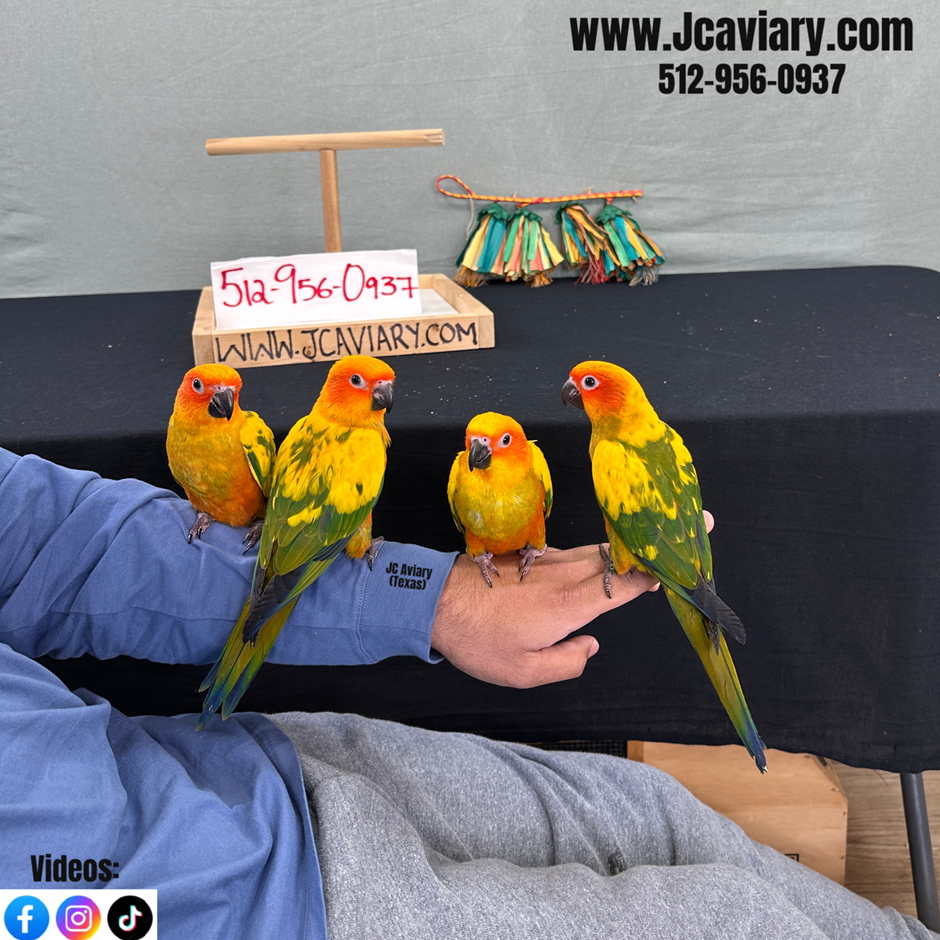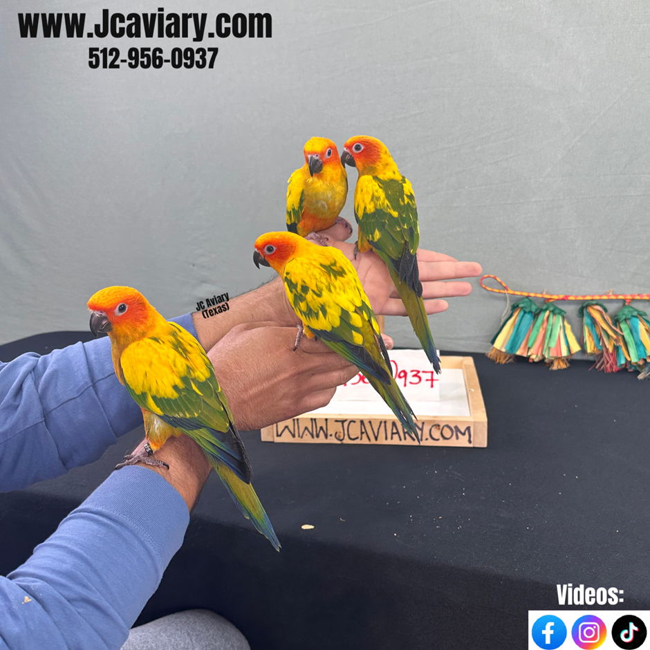 Accepting reservations on these adorable HIGH YELLOW sun conure babies babies. They are being hand-fed but ALMOST weaned. They will be on a healthy diet of organic pellets and vegetables. All our babies are very well socialized, tame and sweet. Please visit our website for full detailed info on these babies -- www.Jcaviary.com-- Please call us to reserve your baby !! 512-956-0937 - Shipping available via Delta Airlines-- All babies are DISEASE TESTED and come with avian vet documents as well. (Deposit: $400 required to reserve each baby) Videos available on Facebook: https://facebook.com/jcaviary