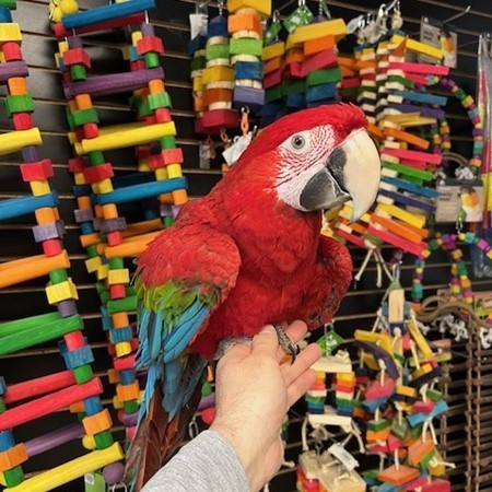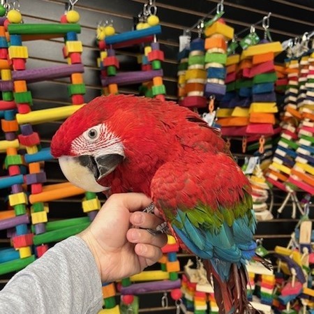 Very sweet and tame dna tested female baby Green Wing Macaw available weaned and ready for its new home. For more info call 773-317-3785. We are located at 710 Lee St., Des Plaines, IL 60016.