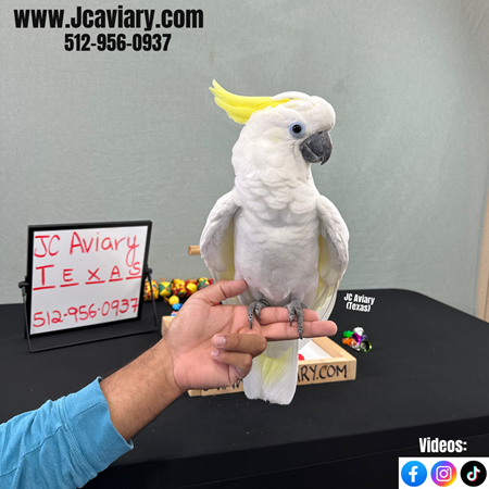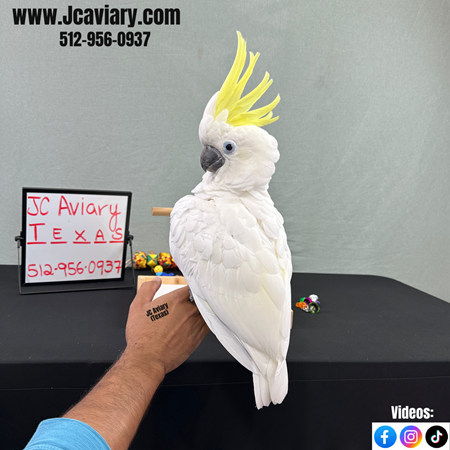 Accepting reservation on this adorable Triton cockatoo baby. He is still being hand-fed and trained. He will be on a healthy diet of organic pellets and vegetables. All our babies are very well socialized, tame and sweet. Please visit our website for full detailed info on these babies -- www.Jcaviary.com-- Please call us to reserve your baby !! 512-956-0937 - Shipping available via Delta Airlines-- All babies are DISEASE TESTED and come with avian vet documents as well. (Deposit: $2500 required to reserve each baby) Videos available on Facebook: https://facebook.com/jcaviary
