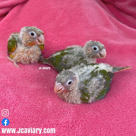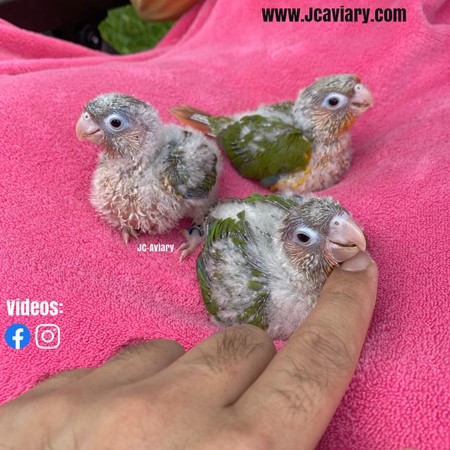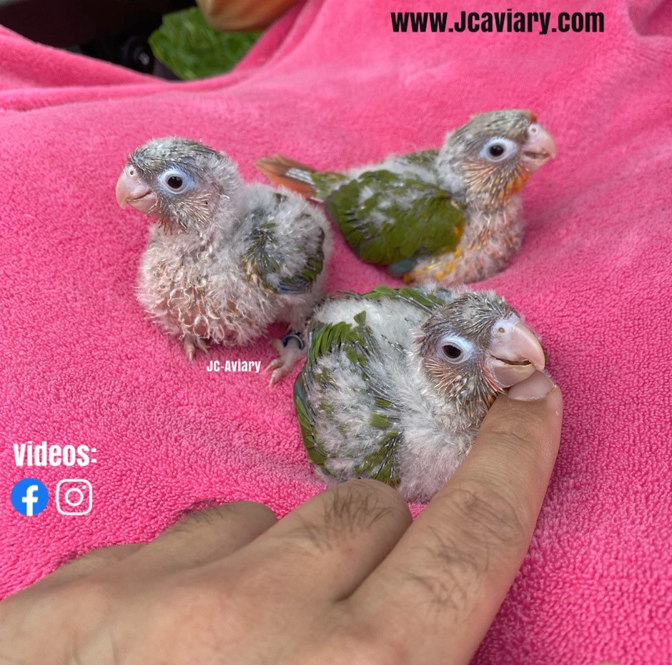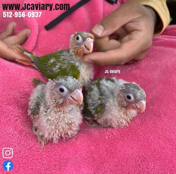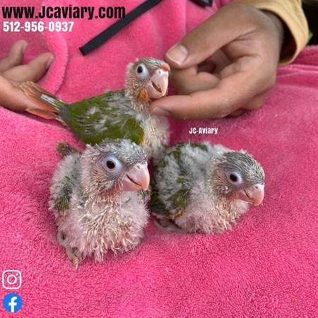 Accepting reservations on these adorable Pineapple green cheek conure babies. They are now being hand-fed and will be fully trained as well. They will be on a healthy diet of organic pellets and vegetables. All our babies are very well socialized, tame and sweet. Please visit our website for full detailed info on these babies -- www.Jcaviary.com-- Please call us to reserve your baby !! 512-956-0937 - Shipping available via Delta Airlines-- All babies are DISEASE TESTED and come with avian vet documents as well. (Deposit: $300 required to reserve each baby) Videos available on Facebook: https://facebook.com/jcaviary