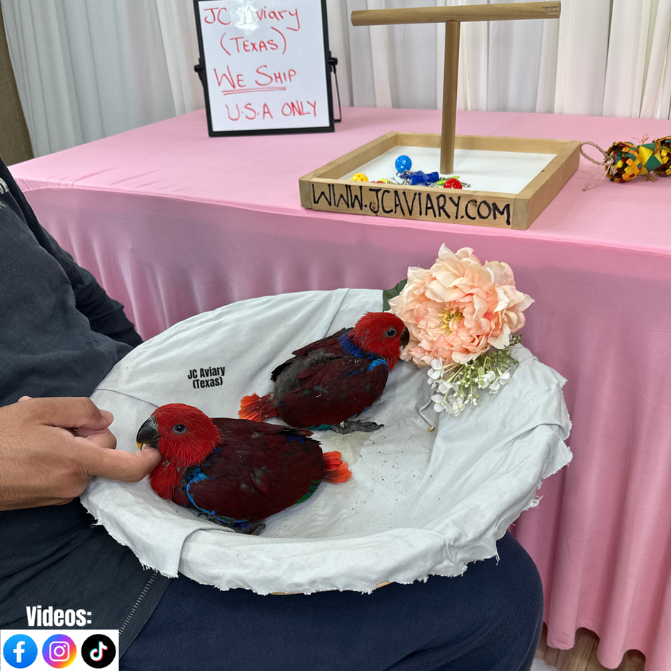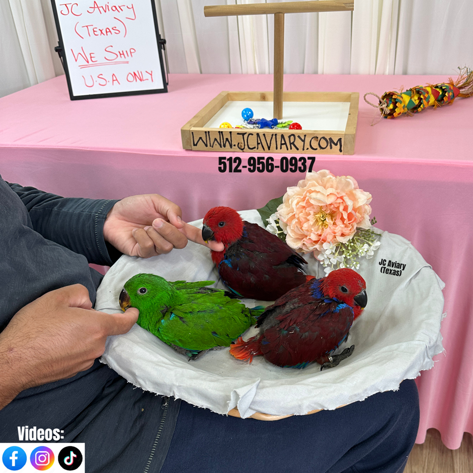 Accepting reservations on these adorable female Eclectus parrot babies. They are currently being hand-fed and will be fully trained as well. They will be on a healthy diet of organic pellets and vegetables. All our babies are very well socialized, tame and sweet. Please visit our website for full detailed info on these babies -- www.Jcaviary.com-- Please call us to reserve your baby !! 512-956-0937 - Shipping available via Delta Airlines-- All babies are DISEASE TESTED and come with avian vet documents as well. (Deposit: $2500 required to reserve each baby) Videos available on Facebook: https://facebook.com/jcaviary