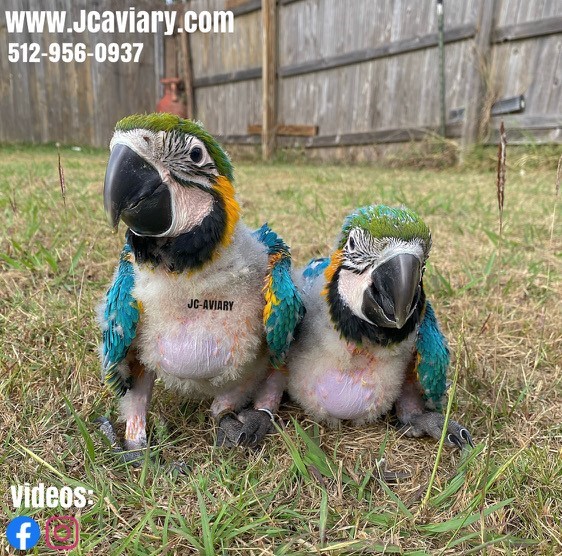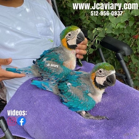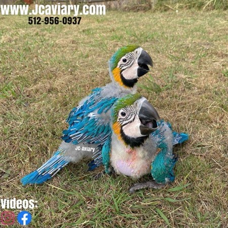 Accepting reservations on these adorable Blue and gold macaw babies. They are now being hand-fed and will be fully trained as well. They will be on a healthy diet of organic pellets and vegetables. All our babies are very well socialized, tame and sweet. Please visit our website for full detailed info on these babies -- www.Jcaviary.com-- Please call us to reserve your baby !! 512-956-0937 - Shipping available via Delta Airlines-- All babies are DISEASE TESTED and come with avian vet documents as well. (Deposit: $2500 required to reserve each baby) Videos available on Facebook: https://facebook.com/jcaviary