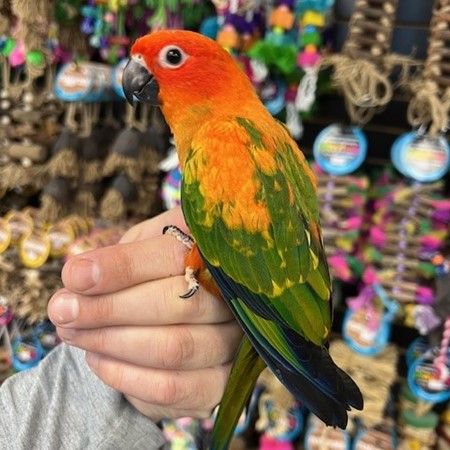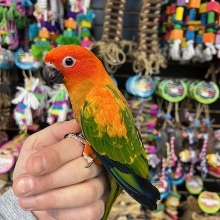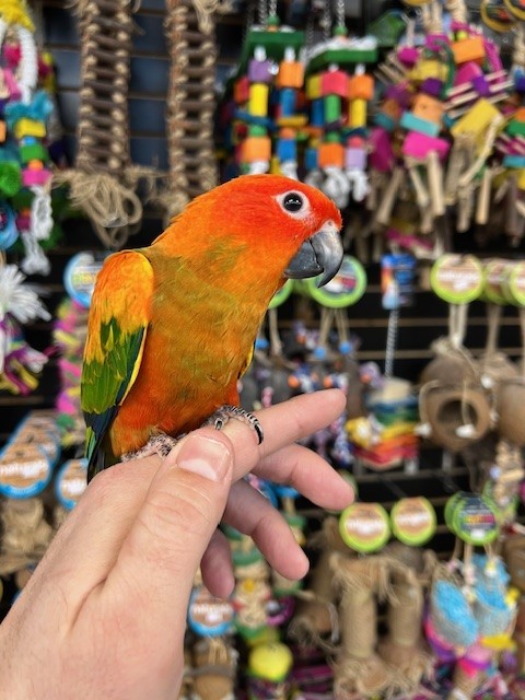 Hand fed baby Red Factor Sun Conure. For more info call 773-317-3785. We are located at 710 Lee St., Des Plaines, IL 60016.