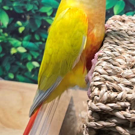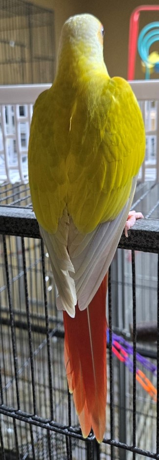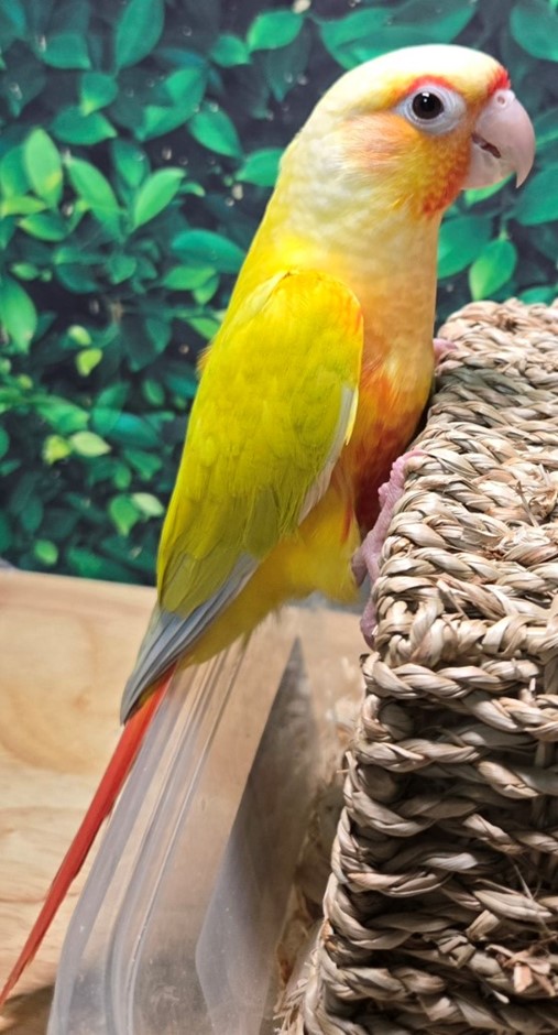 Meet this stunning Sun Cheek Green Cheek Conure, a vibrant little jewel with a personality as bright as her colors. She is DNA‑confirmed female, band #601, and hatched February 2026.