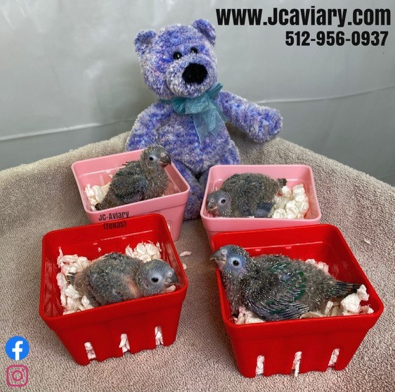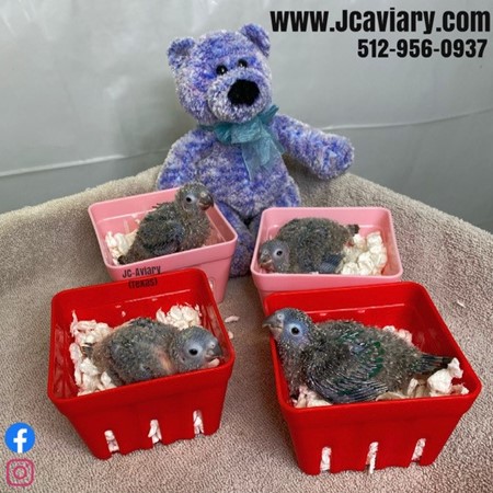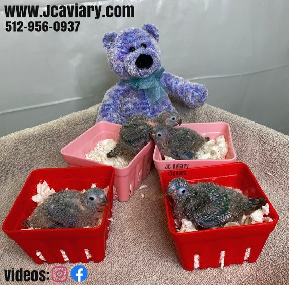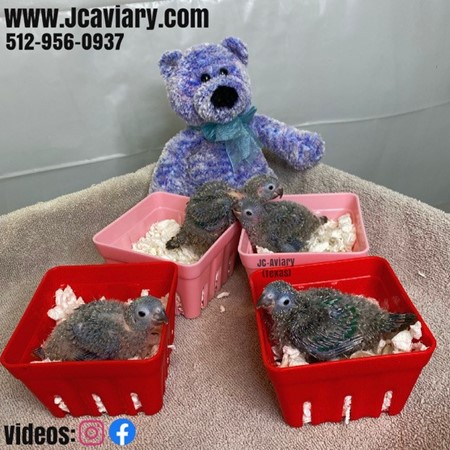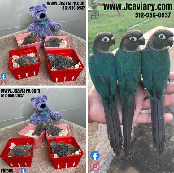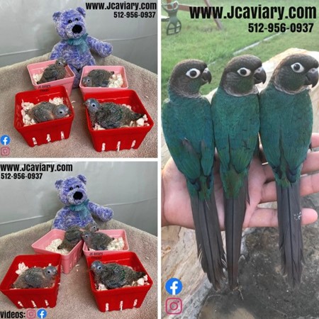 Accepting reservations on these adorable Turquoise Green cheek conure babies. They are now being hand-fed and will be trained as well. They will be on a healthy diet of organic pellets and vegetables. All our babies are very well socialized, tame and sweet. Please visit our website for full detailed info on these babies -- www.Jcaviary.com-- Please call us to reserve your baby !! 512-956-0937 - Shipping available via Delta Airlines-- All babies are DISEASE TESTED and come with avian vet documents as well. (Deposit: $300 required to reserve each baby) Videos available on Facebook: https://facebook.com/jcaviary