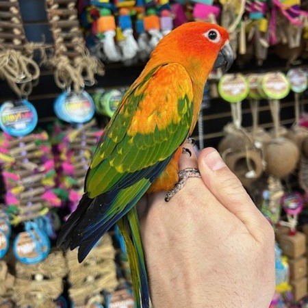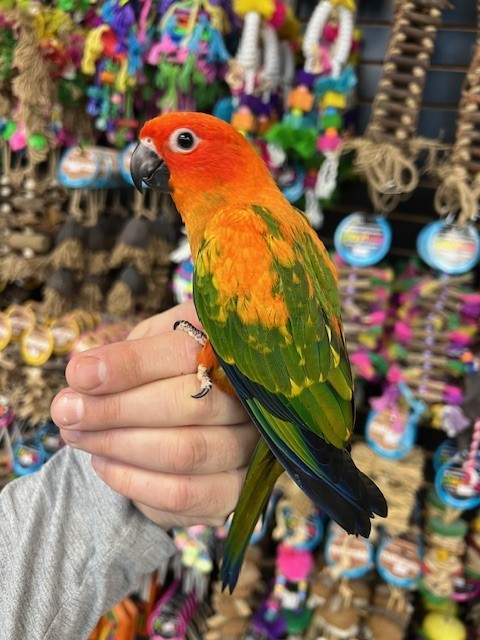 Hand fed baby Red Factor Sun Conure. For more info call 773-317-3785. We are located at 710 Lee St., Des Plaines, IL 60016.