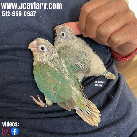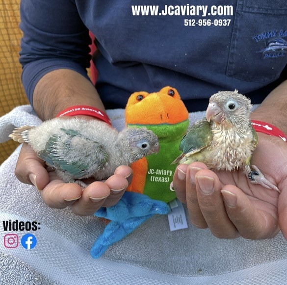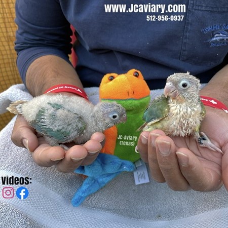 Accepting reservations on these adorable turquoise pineapple green cheek conure babies. They are now being hand-fed and will be fully trained as well. They will be on a healthy diet of organic pellets and vegetables. All our babies are very well socialized, tame and sweet. Please visit our website for full detailed info on these babies -- www.Jcaviary.com-- Please call us to reserve your baby !! 512-956-0937 - Shipping available via Delta Airlines-- All babies are DISEASE TESTED and come with avian vet documents as well. (Deposit: $300 required to reserve each baby) Videos available on Facebook: https://facebook.com/jcaviary