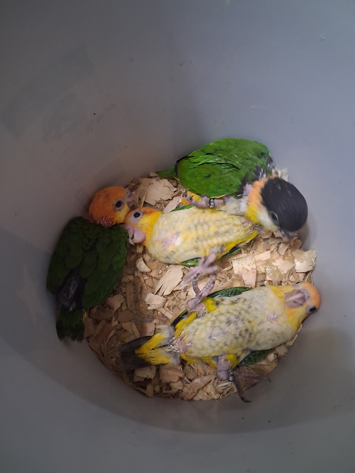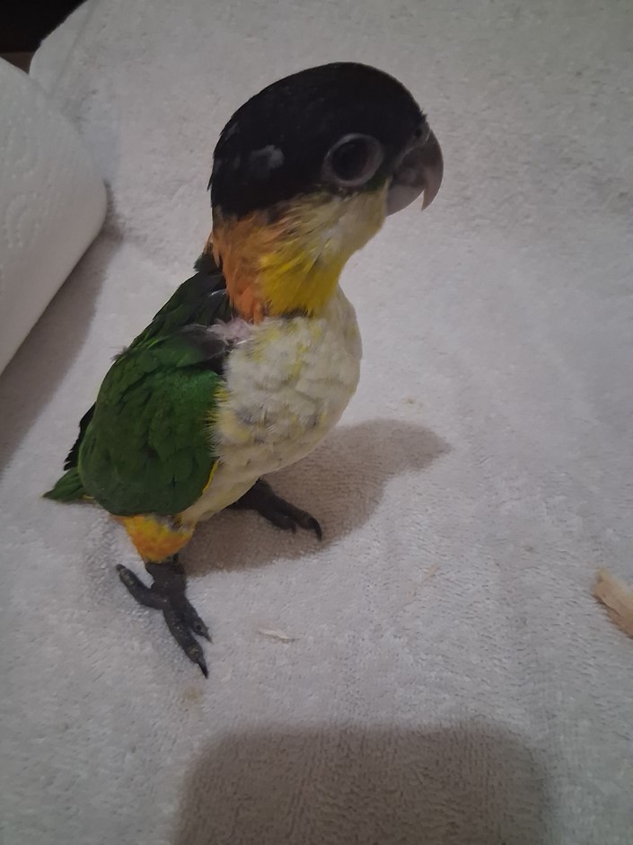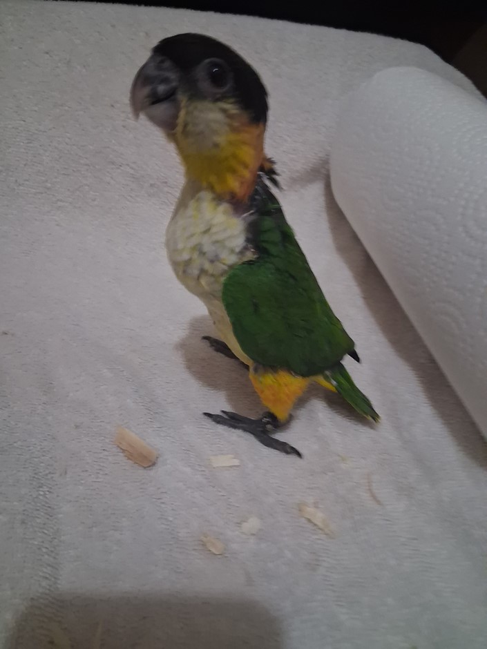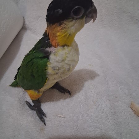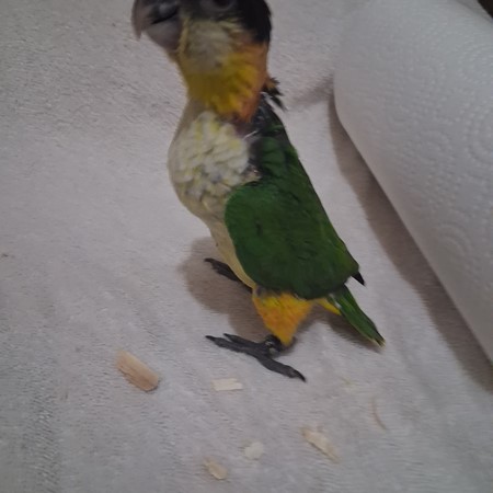 This DNA sexed Black Headed Caique male is one of two hatchlings that were the first of the season for me. He was left with his parents for the first month of his life. At that point I started the hand feeding process with three female White Bellied Caiques that hatched out the same day and for a couple days after. He defiantly enjoys the company of girls.. I welcome p[eople to come to my home when purchasing one of my babies. You see exactly what your getting. A well balanced and life long friend and companion. This baby will be a joy to whom ever decides to take him home. I do ship. Please check out my reviews at Birdbreeders.com under Altum Aviarys. Its very important to me that everyone get a companion pet that is super healthy and a loving pet. For any further information please contact me at 409-255-1842. This bay should be ready for its new home around the 7th of May.