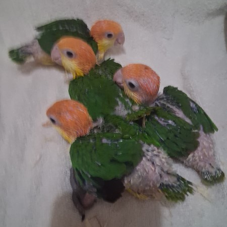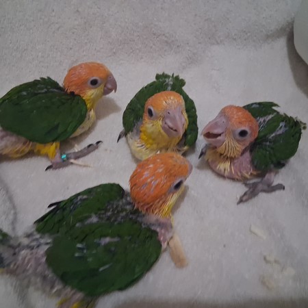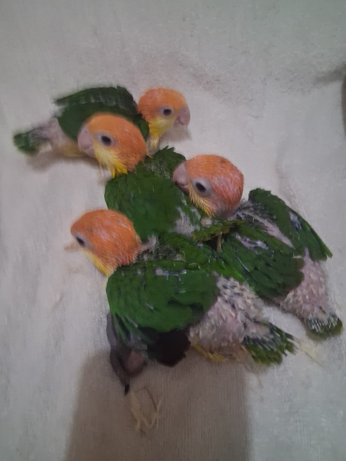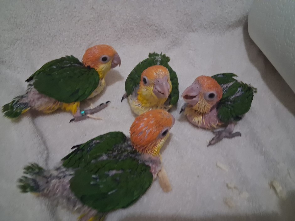 These four White Bellied Caiques started hatching out on the 28th of February this year. The four hatched out in a five day period. I left them with their parents until the youngest one was a month old. They get all the benefits of digestive enzymes that way. At that point I took over the parental duties of their parents. These babies have exceptional orange feather quality in their head pieces. These babies could be ready for their new homess by the first of June. Please check out my reviews on Birdbreeders.com. My listing is under Altum Aviary's in Texas. It's very important to me that when one of my babies is going to a new home that the purchaser is entirely happy with it. Please, I do send videos if your interested in purchasing a baby. I do ship. For any further information, please contact me at 409-255-1842. I do also have unrelated babies if someone is wanting to set up a pair.