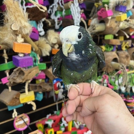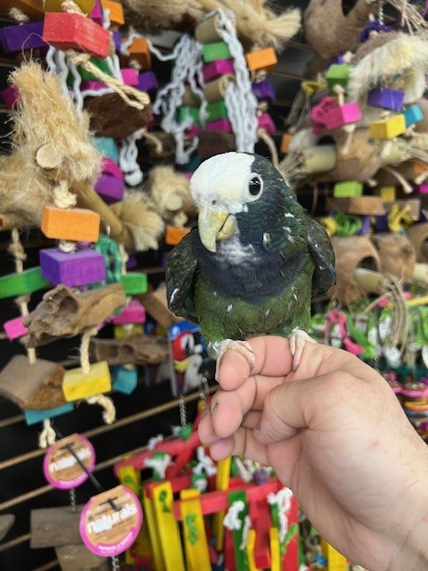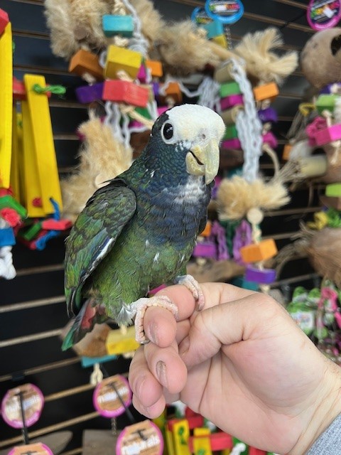 Hand fed 2025 hatch White Cap Pionus available dna tested male. Can be shy at times but is a very healthy beautiful bird. Call us for more info 773 317 3785.
