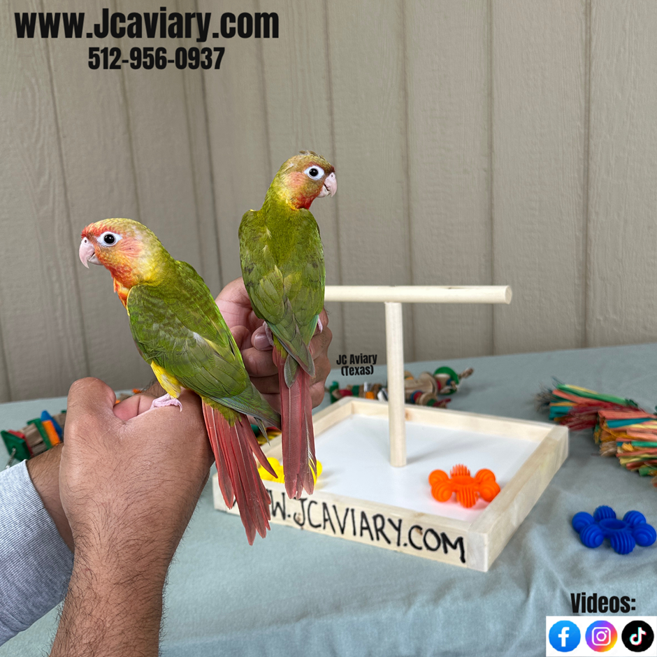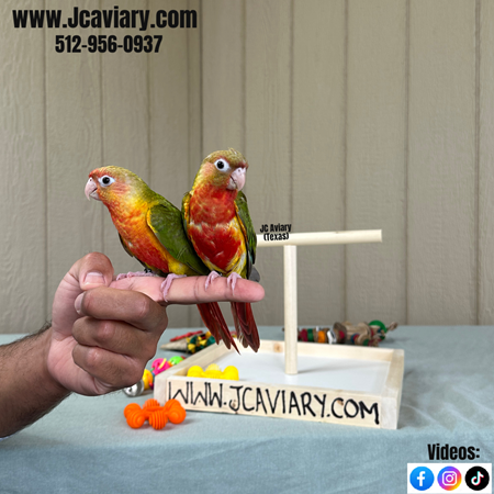 Accepting reservations on these adorable HIGH-RED Pineapple green cheek conure babies. They are still being hand-fed and socialized. They will be on a healthy diet of organic pellets and vegetables. All our babies are very well socialized, tame and sweet. Please visit our website for full detailed info on these babies -- www.Jcaviary.com-- Please call us to reserve your baby !! 512-956-0937 - Shipping available via Delta Airlines-- All babies are DISEASE TESTED and come with avian vet documents as well. (Deposit: $300 required to reserve each baby) Videos available on Facebook: https://facebook.com/jcaviary