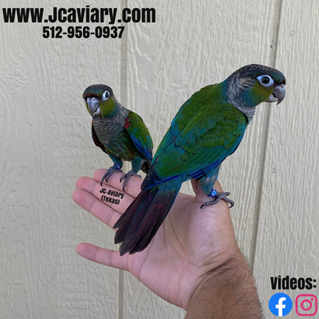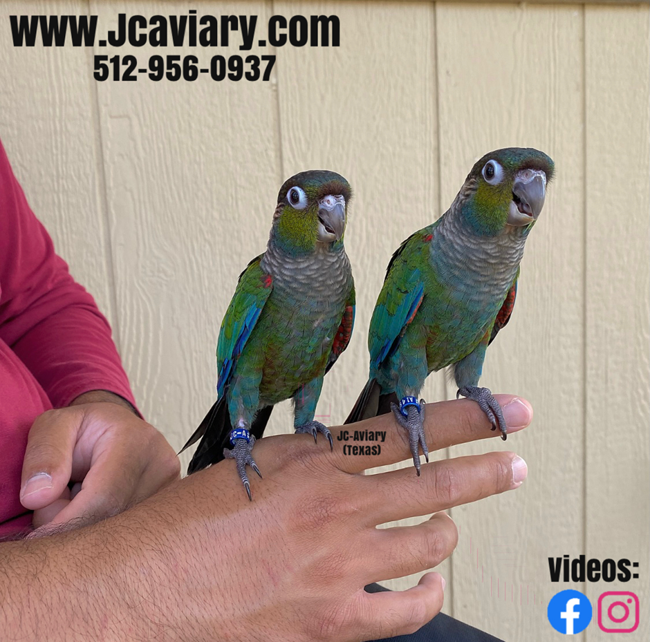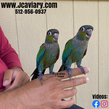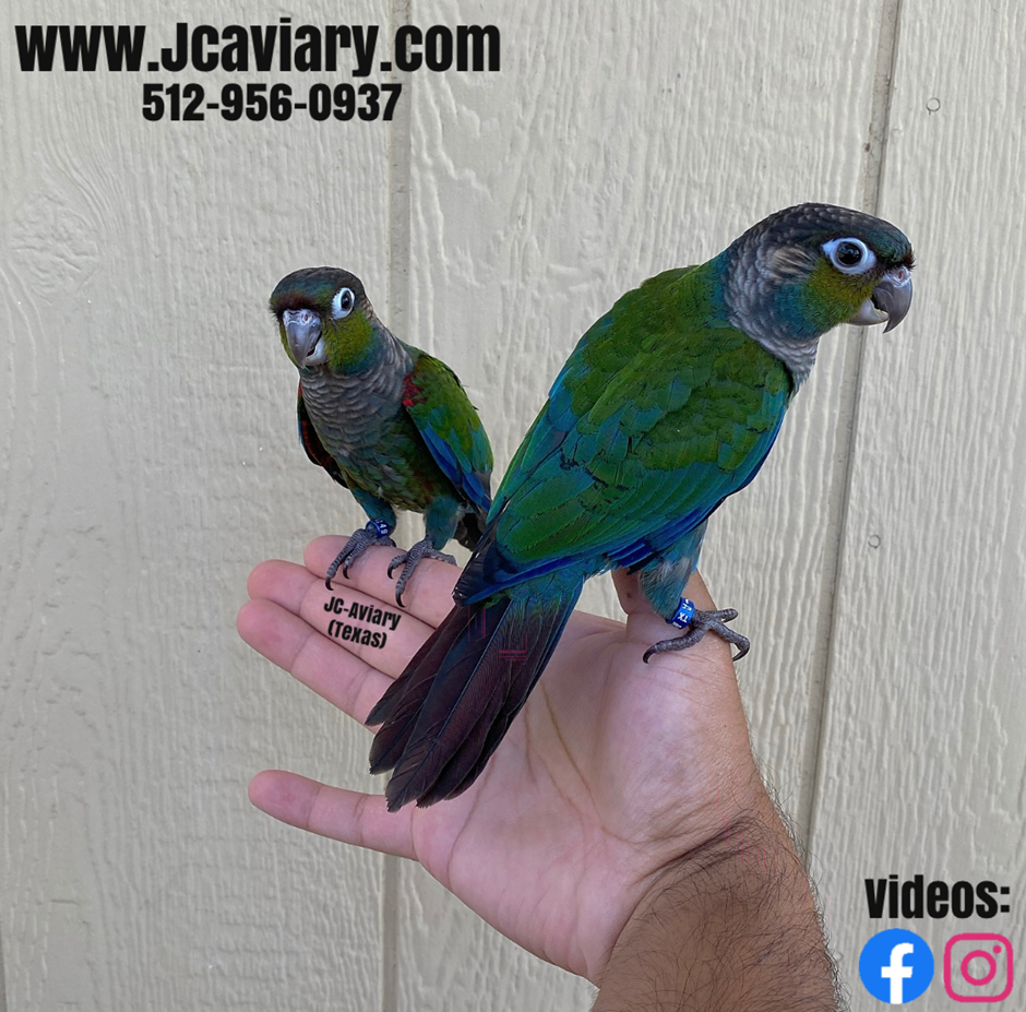 Accepting reservations on these adorable Crimson bellied conure babies. They are still being hand-fed and will be fully trained as well. They will be on a healthy diet of organic pellets and vegetables. All our babies are very well socialized, tame and sweet. Please visit our website for full detailed info on these babies -- www.Jcaviary.com-- Please call us to reserve your baby !! 512-956-0937 - Shipping available via Delta Airlines-- All babies are DISEASE TESTED and come with avian vet documents as well. (Deposit: $800 required to reserve each baby) Videos available on Facebook: https://facebook.com/jcaviary