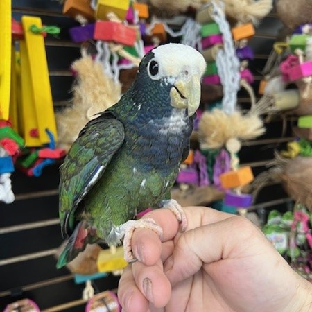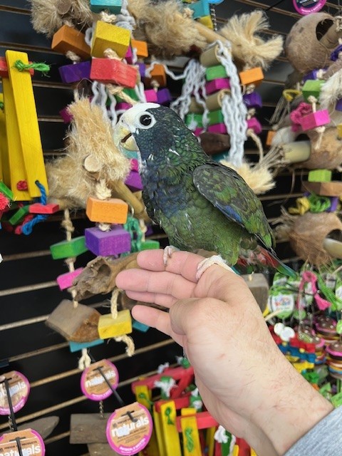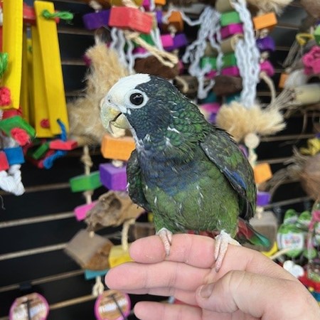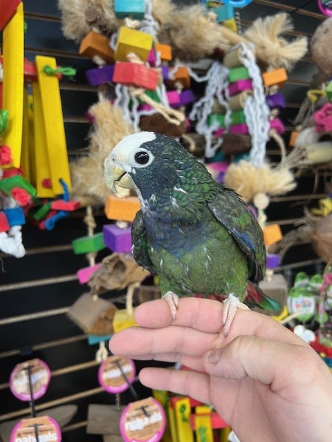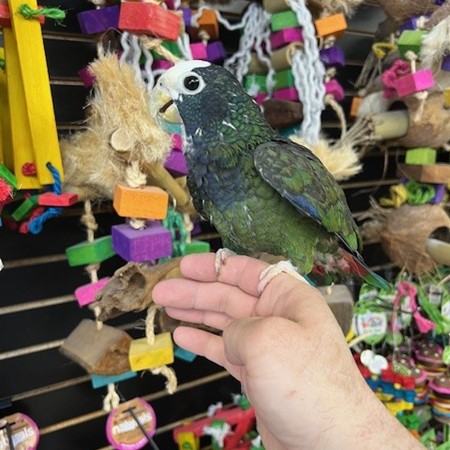 Hand fed 2025 hatch White Cap Pionus available dna tested male. Can be shy at times but is a very healthy beautiful bird. Call us for more info 773 317 3785.