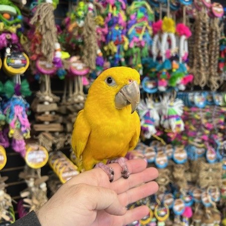 Very tame and sweet Golden Conure, loves to be out and socialized and loves to cuddle. Call us for more info 773 317 3785.
