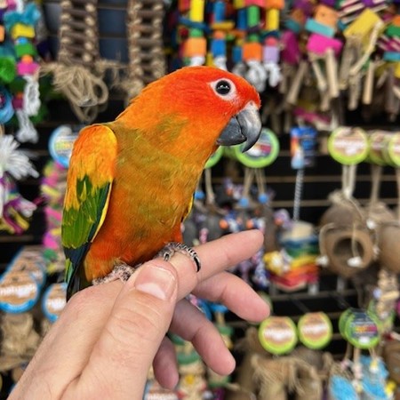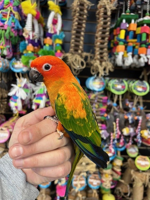 Hand fed baby Red Factor Sun Conure. For more info call 773-317-3785. We are located at 710 Lee St., Des Plaines, IL 60016.