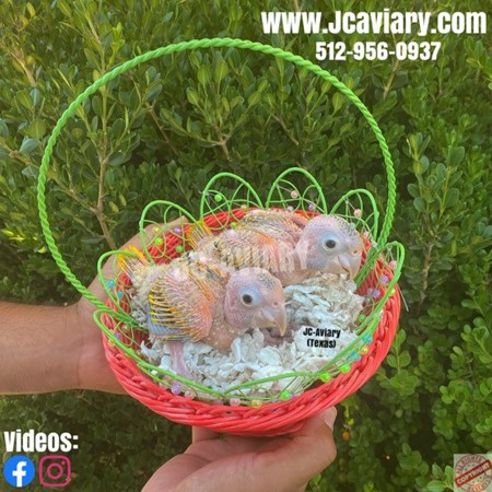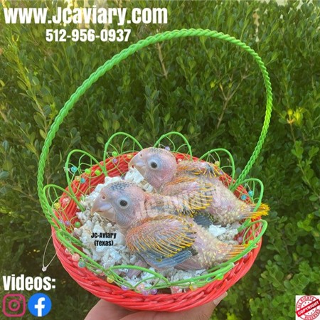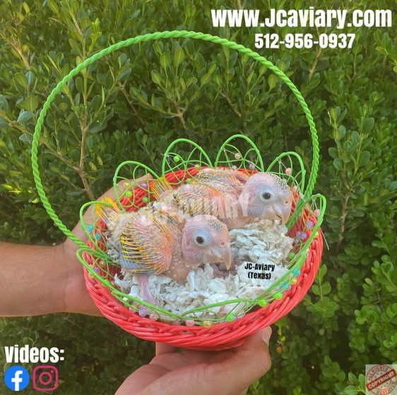 Accepting reservations on these adorable Golden Conure babies. They just hatched and are currently being hand-fed and will be fully trained as well. They will be on a healthy diet of organic pellets and vegetables. All our babies are very well socialized, tame and sweet. Please visit our website for full detailed info on these babies -- www.Jcaviary.com-- Please call us to reserve your baby !! 512-956-0937 - Shipping available via Delta Airlines-- All babies are DISEASE TESTED and come with avian vet documents as well. (Deposit: $2500 required to reserve each baby) Videos available on Facebook: https://facebook.com/jcaviary