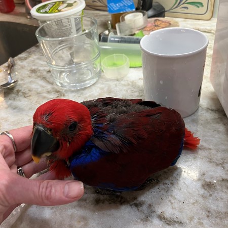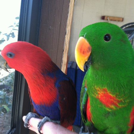 Eclectus pure Solomon Island 1 female ready for Christmas . Hatch date Sept 16, 2023. She is eating fruit vegetables and only wanting an evening formula feeding at the moment and I haven’t updated her photo. She has started to fly and starting to be able to land in th vicinity she is aiming for? This is a seeet girl! Parrots are weaned onto Zupreem dye free pellets softened, fresh fruits, and vegetables. Should be weaned mid to late December. Eclectus are very good talkers, not too noisy, and drop your jaw gorgeous. They stay sweet even after sexual maturity. Many people with allergies are not allergic to eclectus. They have an intelligent nature and obtain vocabularies rivaling African Greys. Shipping delta $280 Other image is parents.
