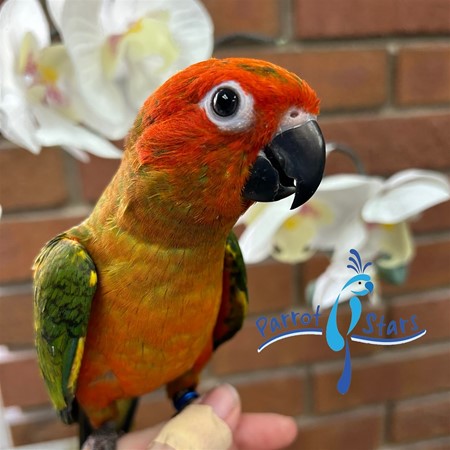 Baby Red Factor Sun Conure (Aratinga solstitialis) Available! Sun Conures are native to South America. Sun Conures are most famously known for their stunning coloration. They make absolutely phenomenal companions. They are playful and incredibly sweet. They love to be out of the cage and they are extremely social. They typically do very well with multiple people within the home, a great family bird. Suns have a very high pitch screech so a high noise level tolerance is a must. If noise is not an issue, they make awesome "starter" birds, but can also make an outstanding addition to an existing flock. Ideally, the minimum cage size for this bird would be 25’’ long, 21’’ wide and 29’’ high with ½’’ wire spacing. At Parrot Stars we focus on education, nutrition, and conservation. We work very hard to help educate our customers on parrot companionship. Prior to taking a bird home, we will provide information on proper housing, creating a safe environment, diet, behavior, hormones and much more. No question will go unanswered. Every hand fed baby is weaned on to a high variety diet. They are weaned onto fruits and veggies, a soak and sprout mix we make here in store, high variety seed that we also make here in store, and naturally colored pellet. If you have questions regarding this baby, or any others that we have available, please give us a call! Feel free to follow us on Facebook @parrotstars for more pictures, videos and information.
