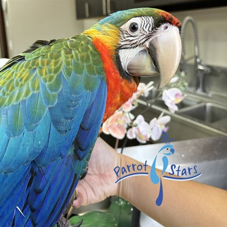 Baby Camelot Macaw Available! Camelot Macaws are a hybrid macaw. They have one Scarlet Macaw Parent and one Catalina (Scarlet+Blue and Gold) Macaw Parent. This baby is absolutely stunning. This color is magnificent and are extremely social. As with any macaw, the decision to add one to your family should not be taken lightly. They are large birds that require large enclosures, a well-rounded diet, and lots and lots of toys. Ideally, the minimum cage size for this size bird is 42"x32"x75" with a 1"bar spacing. A Camelot Macaw can make a wonderful family companion. At Parrot Stars we focus on education, nutrition, and conservation. We work very hard to help educate our customers on parrot companionship. Prior to taking a bird home, we will provide information on proper housing, creating a safe environment, diet, behavior, hormones and much more. No question will go unanswered. Every hand fed baby is weaned on to a high variety diet. They are weaned onto fruits and veggies, a soak and sprout mix we make here in store, high variety seed that we also make here in store, and naturally colored pellet. If you have questions regarding this baby, or any others that we have available, please give us a call! Feel free to follow us on Facebook @parrotstars for more pictures, videos and information.