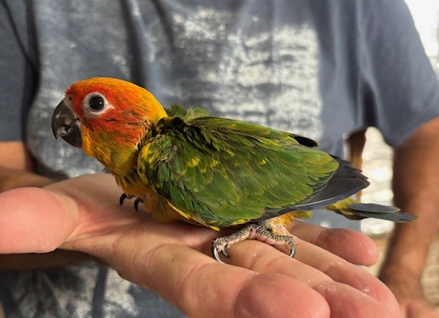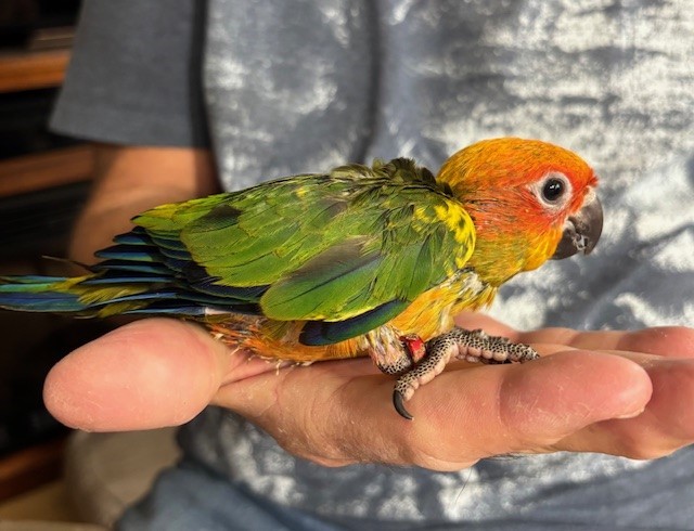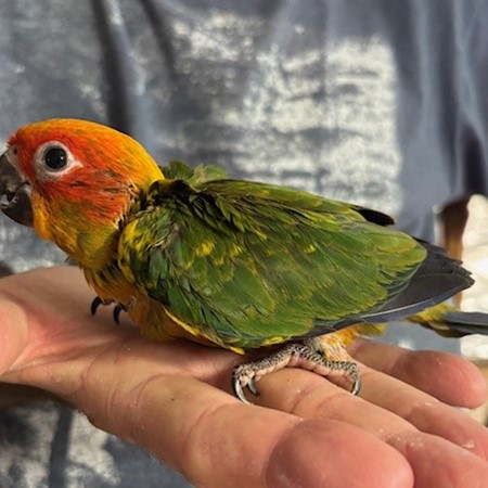 Sun Conure - DNA Male - being hand fed at this time - $450 weaned - will be weaned to eat a pellet diet - $50 deposit will hold this bird until it is weaned and eating well on its own and ready to be shipped. Shipping is with Delta for $165 and the shipping container is $35. Payment through Zelle or PayPal. 4030