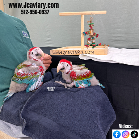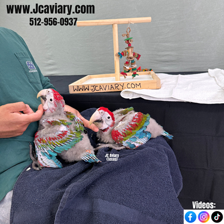 Accepting reservations on these 2 beautiful green wing macaw babies. 1 DNA male and 1 Female. They are currently being hand-fed and will be fully trained as well. They will be on a healthy diet of organic pellets and vegetables. All our babies are very well socialized, tame and sweet. Please visit our website for full detailed info on these babies -- www.Jcaviary.com-- Please call us to reserve your baby !! 512-956-0937 - Shipping available via Delta Airlines-- All babies are DISEASE TESTED and come with avian vet documents as well. (Deposit: $2500 required to reserve each baby) Videos available on Facebook: https://facebook.com/jcaviary
