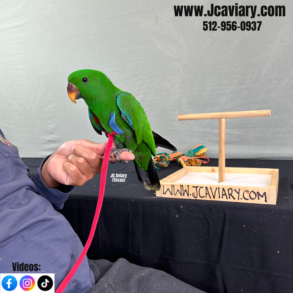Incredibly sweet, hand-fed, tame and fully trained Male Eclectus baby ready now for his forever homes. He is weaned on a healthy diet of organic pellets and vegetables. All our babies are very well socialized, tame and sweet. Please visit our website for full detailed info on these babies -- www.Jcaviary.com-- Please call us to reserve your baby !! 512-956-0937 - Shipping available via Delta Airlines-- All babies are DISEASE TESTED and come with avian vet documents as well. (Deposit: $2500 required to reserve each baby) Videos available on Facebook: https://facebook.com/jcaviary