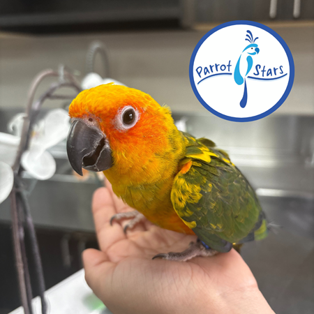 Baby Sun Conure (Aratinga solstitialis) Available! Sun Conures are native to South America. Sun Conures are famously known for their stunning coloration. They are extremely social and can be very charismatic. Suns have a very high pitch screech, so a high noise level tolerance is a must. The bigger the more ideal for the health of your parrot. At Parrot Stars we focus on education, nutrition, and conservation. We work very hard to help educate our customers on parrot companionship. Prior to taking a bird home, we will provide information on proper housing, creating a safe environment, diet, training and much more. No question will go unanswered. Every hand fed baby is weaned on to a high variety diet. They are weaned onto fruits and veggies, a soak and sprout mix made here in store, high variety seed mix that is also made in store, and naturally colored pellets. If you have questions regarding this baby, or any others that we have available, please give us a call at 224-735-7537! Feel free to follow us on Instagram @parrotstars for more pictures, videos and information and explore our website www.parrotstars.com to see all of our available birds.