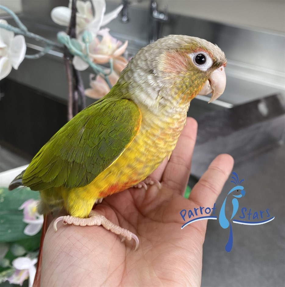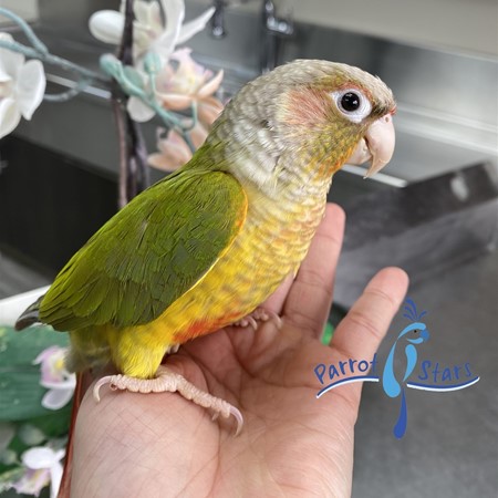 "Scientific Name: Pyrrhura molinae Native Range: South America The Green-cheeked Conure is a small parrot species within the family Psittacidae. It is characterized by predominantly green plumage, a maroon tail, blue flight feathers, and a grayish or brownish crown and cheeks. In the wild, Green-cheeked Conures inhabit forested regions, woodland edges, and scrub habitats across parts of central South America. They typically occupy mid-level forest canopies and nest in tree cavities. IUCN Conservation Status: Least Concern At Parrot Stars, we prioritize education, welfare, and responsible parrot ownership to help ensure every bird finds and thrives in a forever home. Before taking home any parrot, we provide comprehensive guidance on proper caging and setup, positive reinforcement training, household safety, nutrition, and enrichment. Parrots in captivity are still wild animals with all their natural instincts. Your overall success and experience with any species of companion parrot is greatly impacted by positive reinforcement training. A parrot’s behavior reflects both the environment they live in and the training they receive. All of our hand-fed babies are hatched and raised in our own breeding facility and weaned onto a diverse, high-variety diet. Our parrots are never clipped and are fully flighted. Follow our Parrot Stars Podcast to learn all about our parrots, our purchase process, and our philosophy of parrot care."