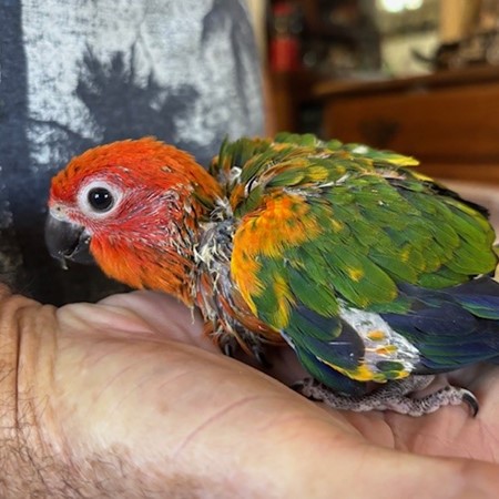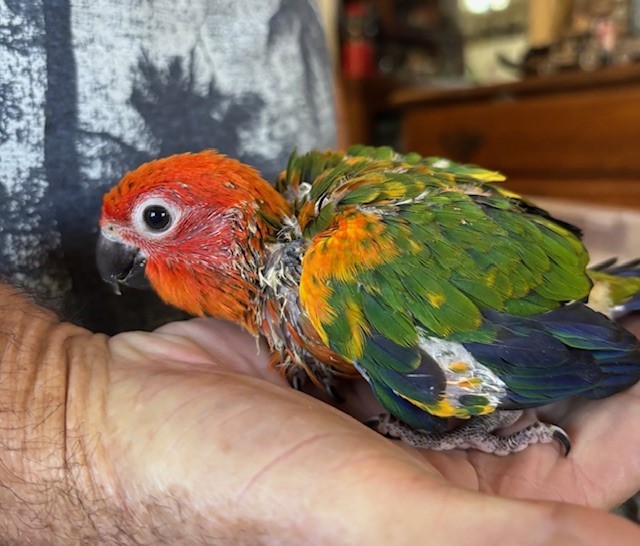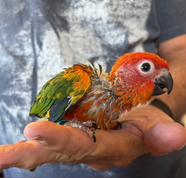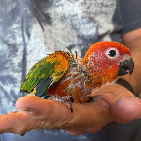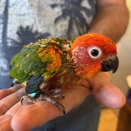 Red Factor Sun Conure - DNA Pending - being hand fed at this time - $750 weaned - will be weaned to eat a pellet diet - $50 deposit will hold this bird until it is weaned and eating well on its own and ready to be shipped. Shipping is with Delta for $165 and the shipping container is $35. Payment through Zelle or PayPal. 1422
