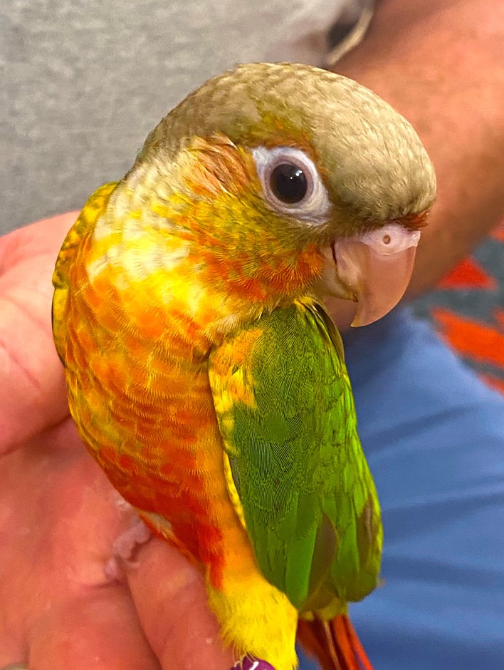 Sunny is an adorable red factor pineapple green cheek conure. Tame, currently being hand fed, and will be weaned and is ready to go by the end of February. Wellness checked. Well socialized. Parents are tested and disease free. Very sweet, loves cuddles Stunning colors, gorgeous little birdie. Local pick up is available. Free cage with local pick up.