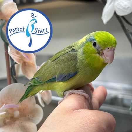 "Scientific Name: Forpus coelestis (Pacific Parrotlet) Native Range: Western Coast, South America The Pacific Parrotlet is an extremely small parrot species within the family Psittacidae and is one of several species commonly referred to as parrotlets. It is characterized by predominantly green plumage, with males typically displaying cobalt-blue markings on the rump, wings, and behind the eyes, while females lack these blue patches. This species is sexually dimorphic. In the wild, Pacific Parrotlets inhabit dry forests, scrublands, and semi-arid regions of western Ecuador and northwestern Peru. They nest in tree cavities and are often observed in small flocks. IUCN Conservation Status: Least Concern At Parrot Stars, we prioritize education, welfare, and responsible parrot ownership to help ensure every bird finds and thrives in a forever home. Before taking home any parrot, we provide comprehensive guidance on proper caging and setup, positive reinforcement training, household safety, nutrition, and enrichment. Parrots in captivity are still wild animals with all their natural instincts. Your overall success and experience with any species of companion parrot is greatly impacted by positive reinforcement training. A parrot’s behavior reflects both the environment they live in and the training they receive. All of our hand-fed babies are hatched and raised in our own breeding facility and weaned onto a diverse, high-variety diet. Our parrots are never clipped and are fully flighted. Follow our Parrot Stars Podcast to learn all about our parrots, our purchase process, and our philosophy of parrot care."