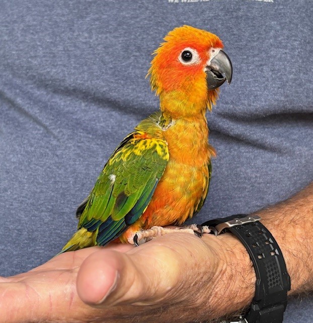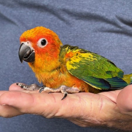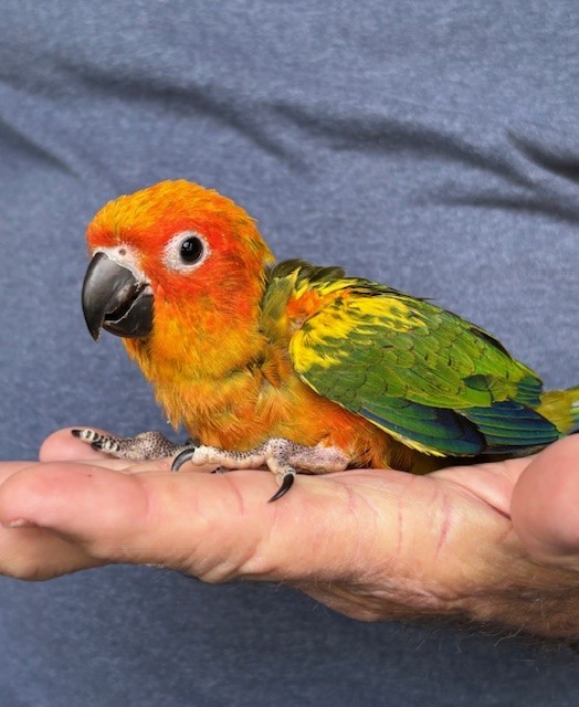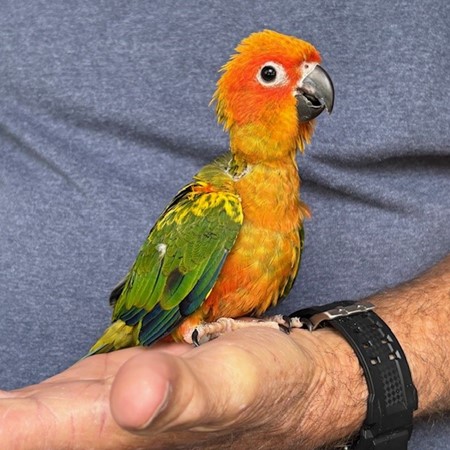 Sun Conure - DNA Male - being hand fed at this time - $450 weaned - will be weaned to eat a pellet diet - $50 deposit will hold this bird until it is weaned and eating well on its own and ready to be shipped. Shipping is with Delta Airlines for $165 and the shipping container is $35. Payment through Zelle or PayPal. 304