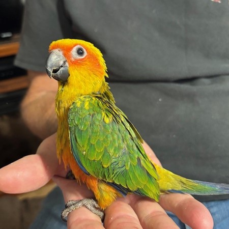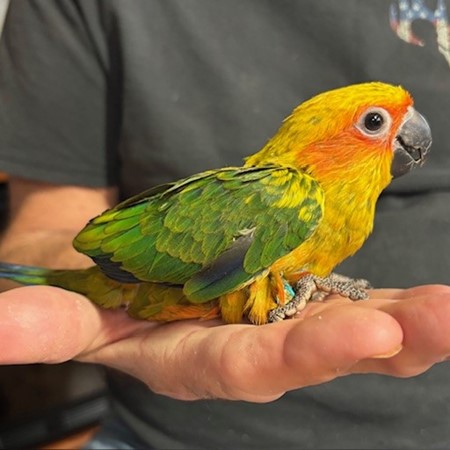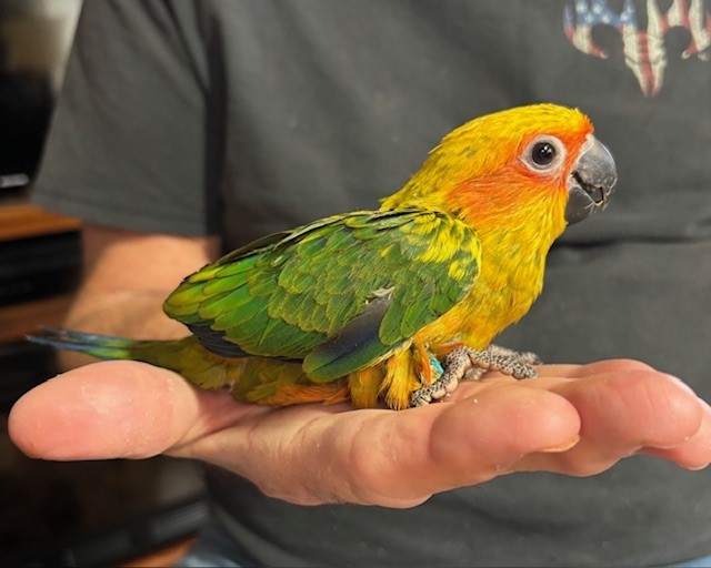 Sun Conure - DNA Pending - being hand fed at this time - $450 weaned - will be weaned to eat a pellet diet - $50 deposit will hold this bird until it is weaned and eating well on its own and ready to be shipped. Shipping is with Delta Airlines for $165 and the shipping container is $35. Payment through Zelle or PayPal. 1437
