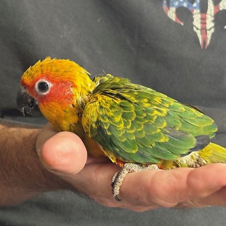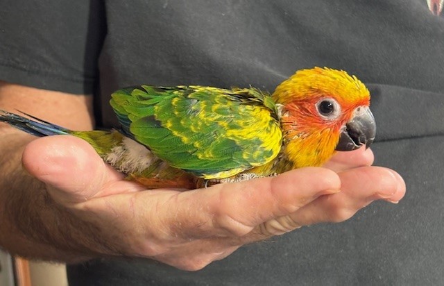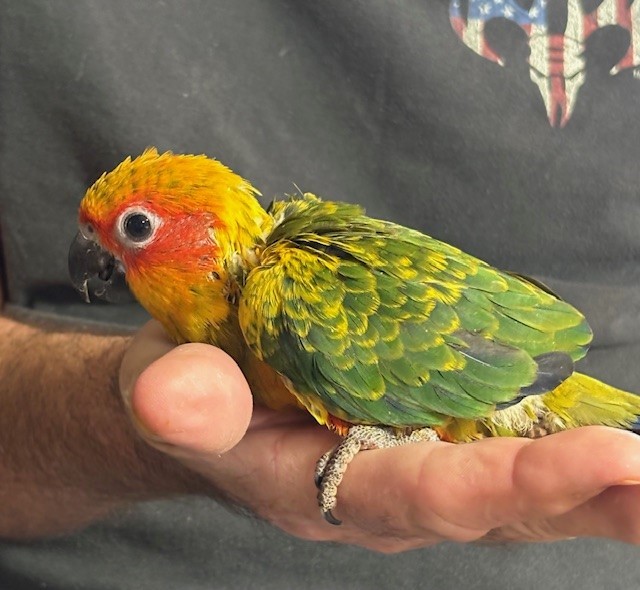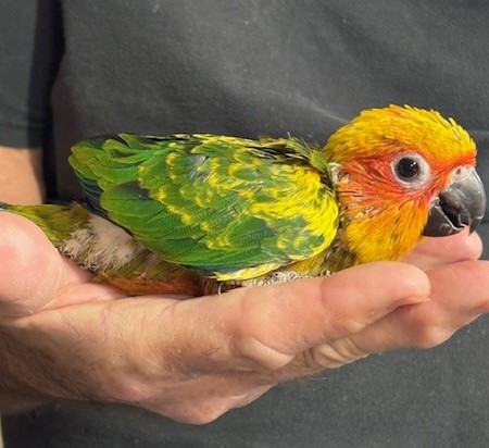 Sun Conure - DNA Pending - being hand fed at this time - $450 weaned - will be weaned to eat a pellet diet - $50 deposit will hold this bird until it is weaned and eating well on its own and ready to be shipped. Shipping is with Delta Airlines for $165 and the shipping container is $35. Payment through Zelle or PayPal. 145