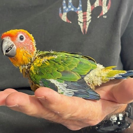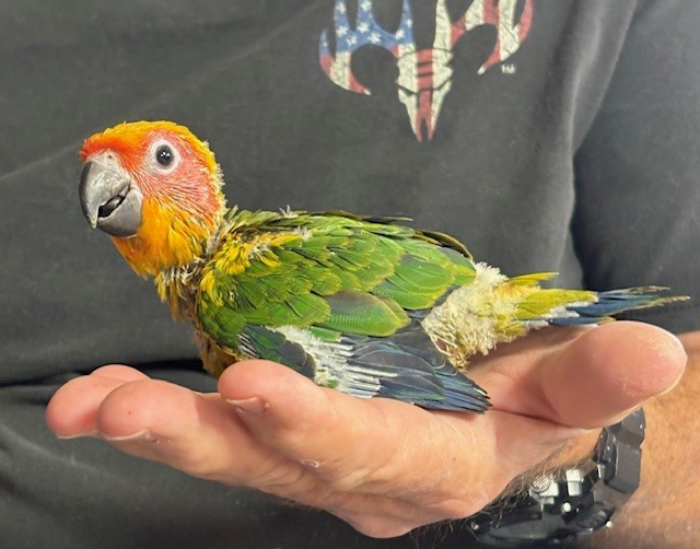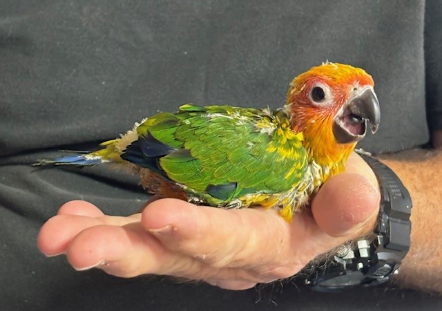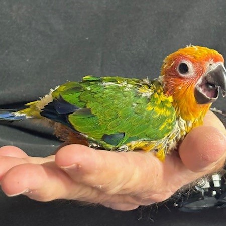 Sun Conure - DNA Pending - being hand fed at this time - $450 weaned - will be weaned to eat a pellet diet - $50 deposit will hold this bird until it is weaned and eating well on its own and ready to be shipped. Shipping is with Delta Airlines for $165 and the shipping container is $35. Payment through Zelle or PayPal. 1443