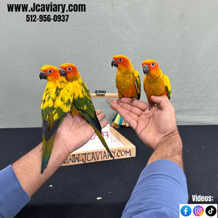 Incredibly sweet, hand-fed, tame and well trained sun conure babies ready now for their forever homes. They are weaned on a healthy diet of organic pellets and vegetables. All our babies are very well socialized, tame and sweet. Please visit our website for full detailed info on these babies -- www.Jcaviary.com-- Please call us to reserve your baby !! 512-956-0937 - Shipping available via Delta Airlines-- All babies are DISEASE TESTED and come with avian vet documents as well. (Deposit: $400 required to reserve each baby) Videos available on Facebook: https://facebook.com/jcaviary