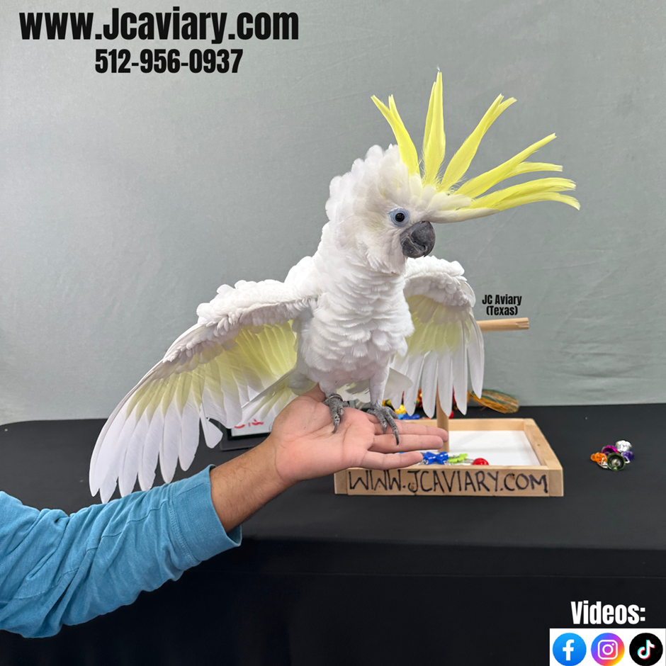 Accepting reservation on this adorable Triton cockatoo baby. He is still being hand-fed and trained. He will be on a healthy diet of organic pellets and vegetables. All our babies are very well socialized, tame and sweet. Please visit our website for full detailed info on these babies -- www.Jcaviary.com-- Please call us to reserve your baby !! 512-956-0937 - Shipping available via Delta Airlines-- All babies are DISEASE TESTED and come with avian vet documents as well. (Deposit: $2500 required to reserve each baby) Videos available on Facebook: https://facebook.com/jcaviary