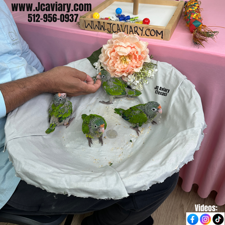 Accepting reservations on these adorable Half-moon conure babies. They are now being hand-fed and will be trained as well. They will be on a healthy diet of organic pellets and vegetables. All our babies are very well socialized, tame and sweet. Please visit our website for full detailed info on these babies -- www.Jcaviary.com-- Please call us to reserve your baby !! 512-956-0937 - Shipping available via Delta Airlines-- All babies are DISEASE TESTED and come with avian vet documents as well. (Deposit: $300 required to reserve each baby) Videos available on Facebook: https://facebook.com/jcaviary